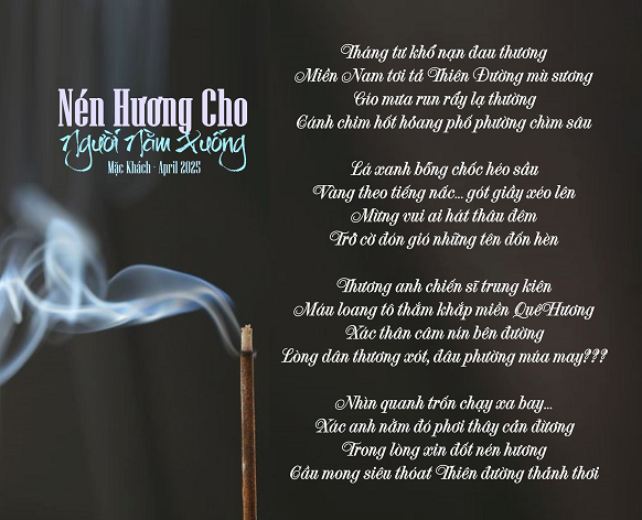 Tháng Tư vừa mới chớm, trái tim của những người con Việt hải ngoại không ngớt rỉ máu, vết thương của 51 năm qua vẫn mãi chưa bao giờ lành, một khi quê hương đất mẹ vẫn đang bị cầy xéo, dân vẫn khốn đốn, nền tự do dân quyền không có, những cựu chiến binh VNCH với thân hình còi rọc, như những phế nhân lầm lũi sống ở tận đáy xã hội của đất nước nơi mình được sanh ra; họ là những minh chứng sống cho thấy dưới chế độ xã hội chủ nghĩa Cộng Sản sau 51 năm, đời sống không khả quan hơn, vẫn đói khát, bị vùi dập, kiểm soát, bị trả thù đến bao nhiêu kiếp đời.