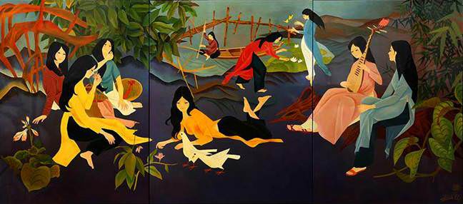 - Suối tóc bộ tranh thiếu nữ ngồi chải tóc trên giường tre bên bụi chuối đong đưa ngoài vườn.