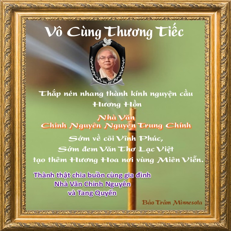 Được tin nhà thơ Chinh Nguyên đã được về chầu Chúa ngày 8 tháng 4 năm 2025. Xa xôi lắm, chúng tôi không thể đích thân đưa tiễn. Đây nén hương lòng cung tiễn anh về với đấng vô cùng. Thành thật chia buồn cùng tang quyến – Đặc biệt bà quả phụ Chinh Nguyên và nhóm chủ trương Văn Thơ Lạc Việt.